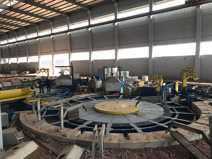 Pour copper water into the casting mold. After casting, the disc rotates two mold positions to cast the next anode plate. After the anode plate is cooled by spraying, the anode plate is loosened from the pre-elevating device. In order to balance the pre-elevating device against the disc Applying upward force, a mold locking mechanism is set above the copper mold at the pre-lifted position; the loosened qualified anode plates are taken away by the extraction machine, and the unqualified anode plates are taken away by the waste anode crane; the extraction machine is taken away The anode plates are placed in the water tank to cool again and are automatically arranged into anode stacks, which are finally transported away by a forklift. The empty copper mold is transferred to the mold coating position, and BaSO is sprayed on it by the mold coating system. mixture to prevent the anode plate from "sticking to the mold". By repeating the above process, continuous casting can be achieved.